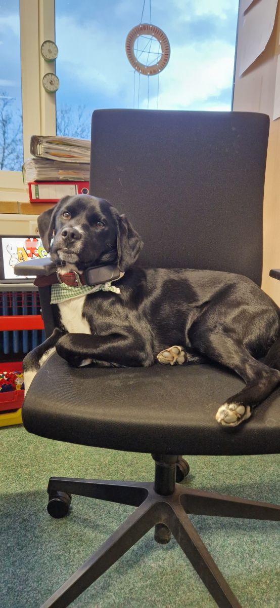 Mogli liebt es, im Mittelpunkt zu stehen und freut sich über jede Streicheleinheit, die er von den Kindern bekommt. Seine freundliche und geduldige Art sorgt dafür, dass sich die Schülerinnen und Schüler in seiner Nähe wohlfühlen und entspannt lernen können. Mogli ist nicht nur ein treuer Begleiter, sondern auch ein wichtiger Bestandteil unseres Schulalltags geworden.