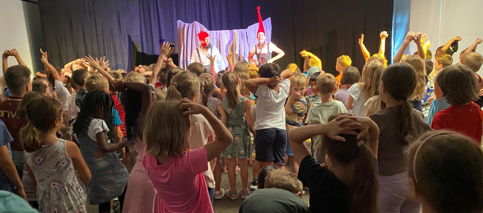 Gemeinsam mit den Schulanfängern der verschiedenen Kindergärten lernten die Erstklässler das Sternenmännlein kennen. Als Erzählzwerge nahmen Marion Witt und Pablo Keller die Kinder mit auf eine bunte Reise in die Welt der Geschichten von den Sternen, die das Männlein den Dorfbewohnern erzählt um ihnen und sich selbst Freude und Glück zu bringen.