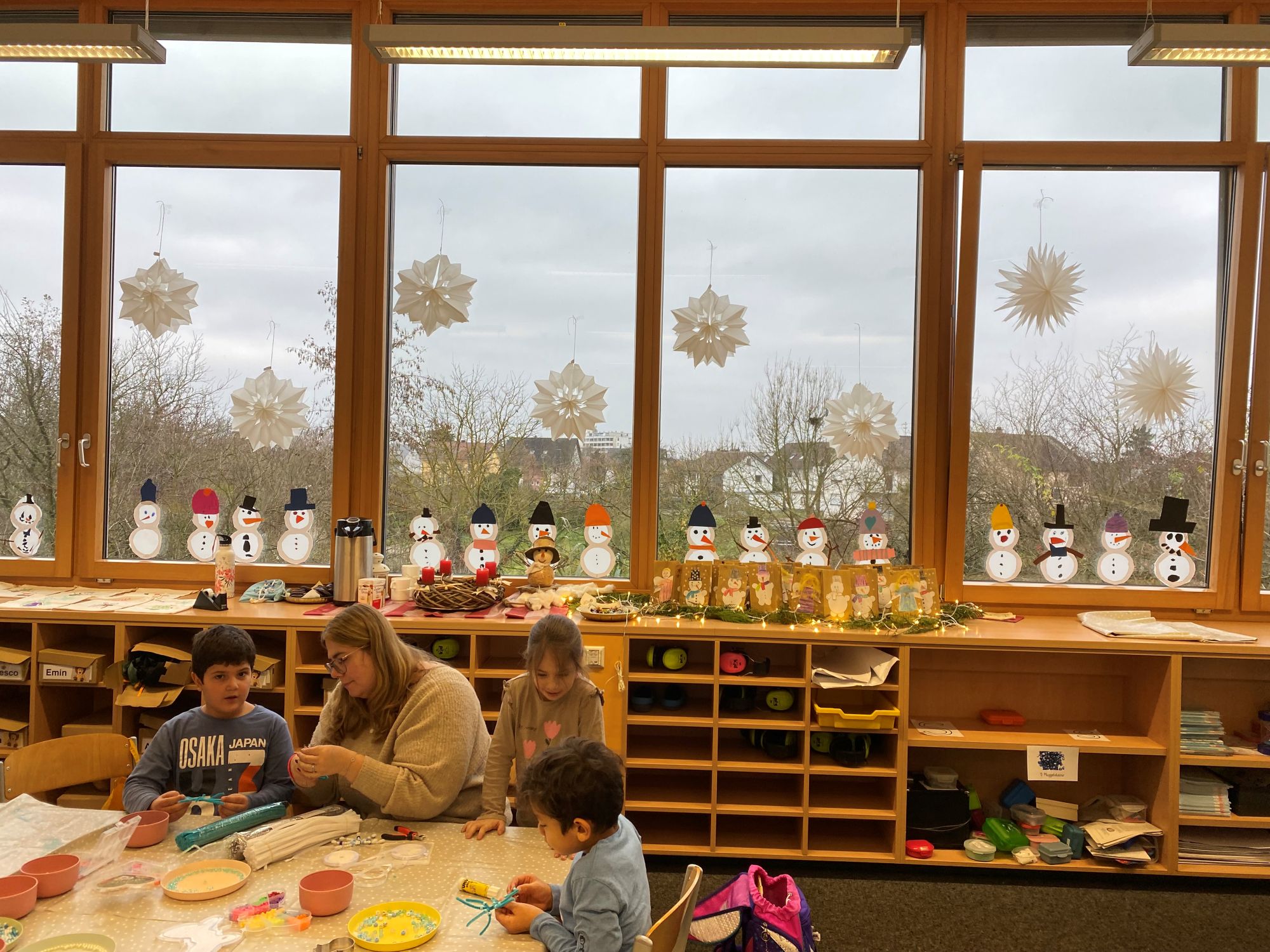 Mit großer Begeisterung entstanden vielfältige weihnachtliche Bastelarbeiten: Aus Butterbrottüten wurden wunderschöne Sterne gefaltet, aus Perlen funkelnde Anhänger gestaltet und liebevoll bemalte Säckchen dekoriert. Besonders beliebt waren auch die kleinen Rentiere, die die Kinder mit viel Geschick und Freude bastelten.