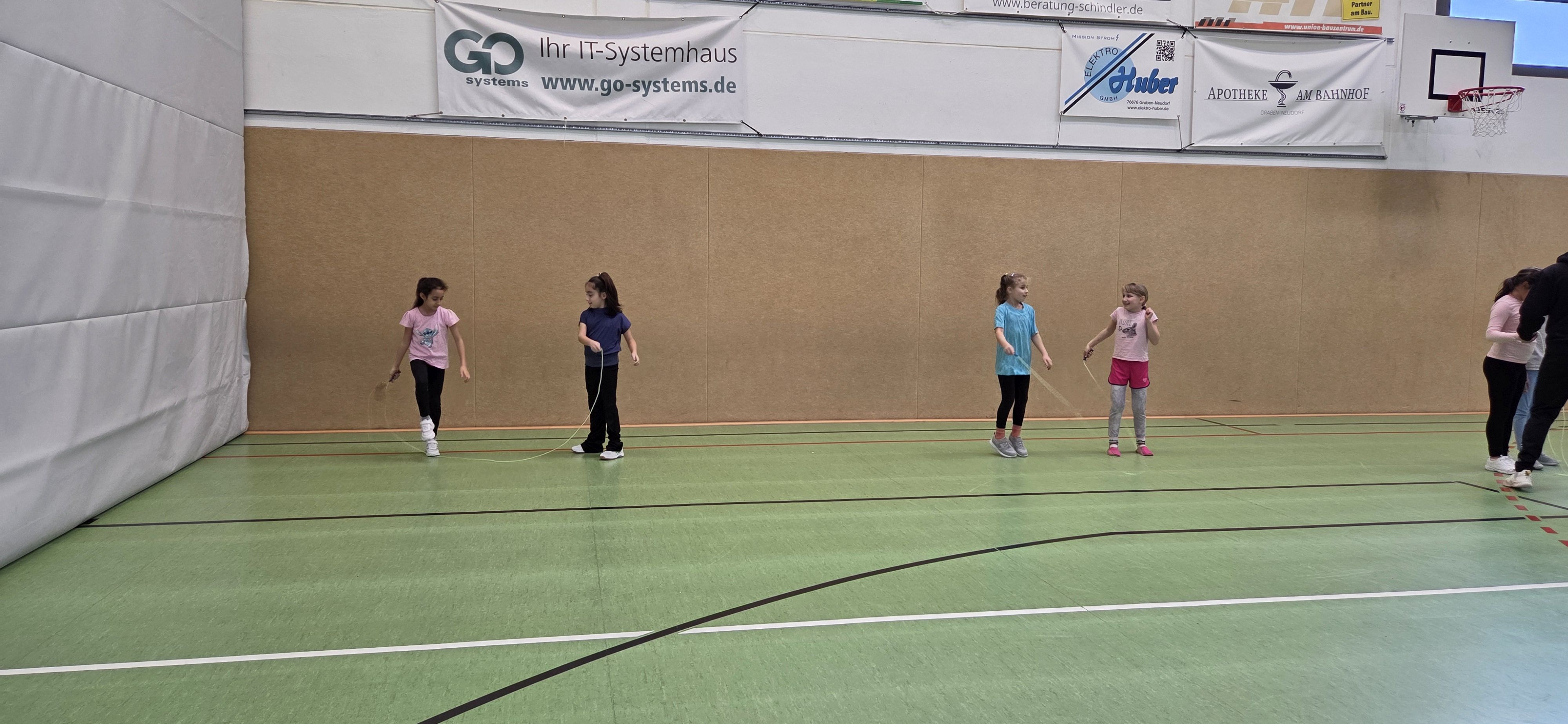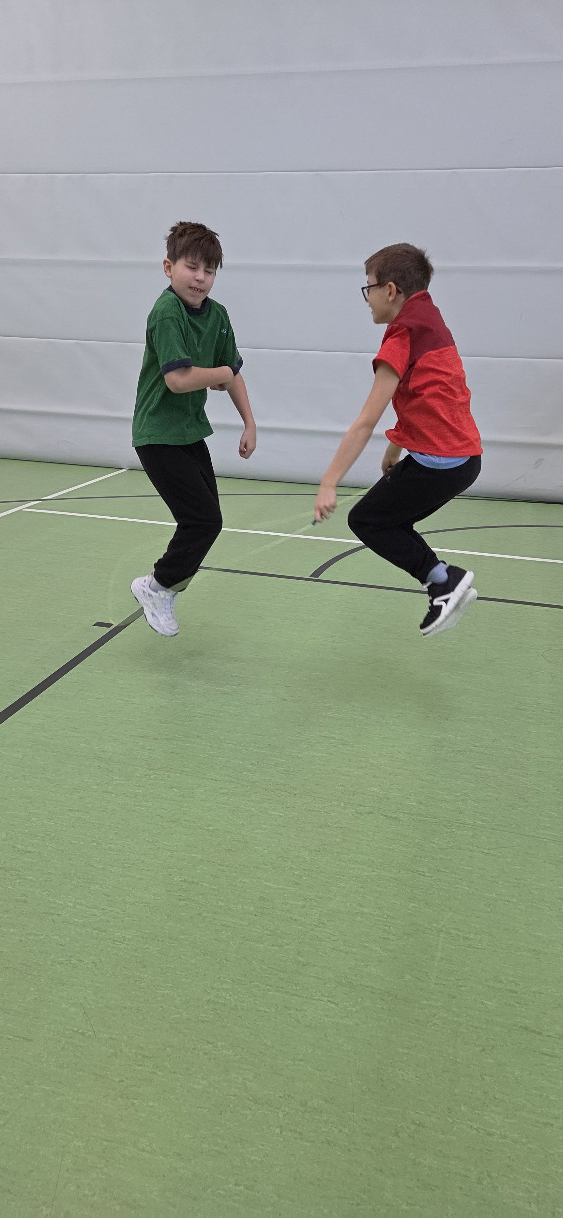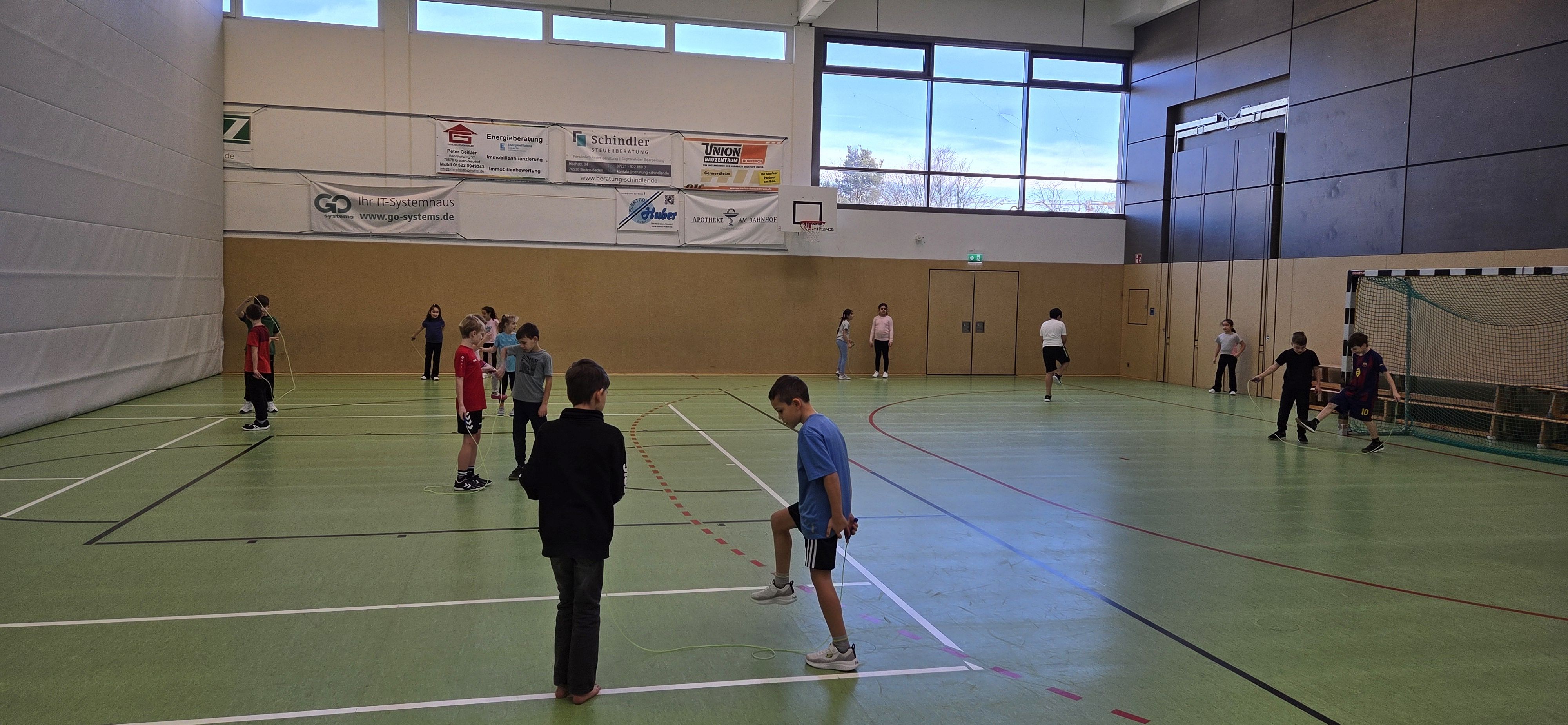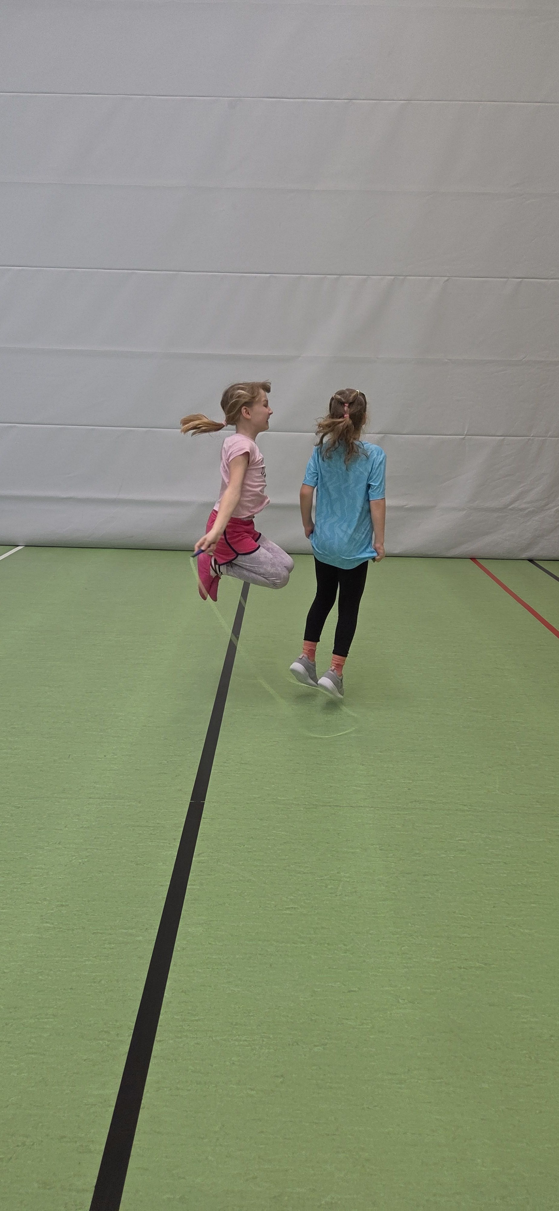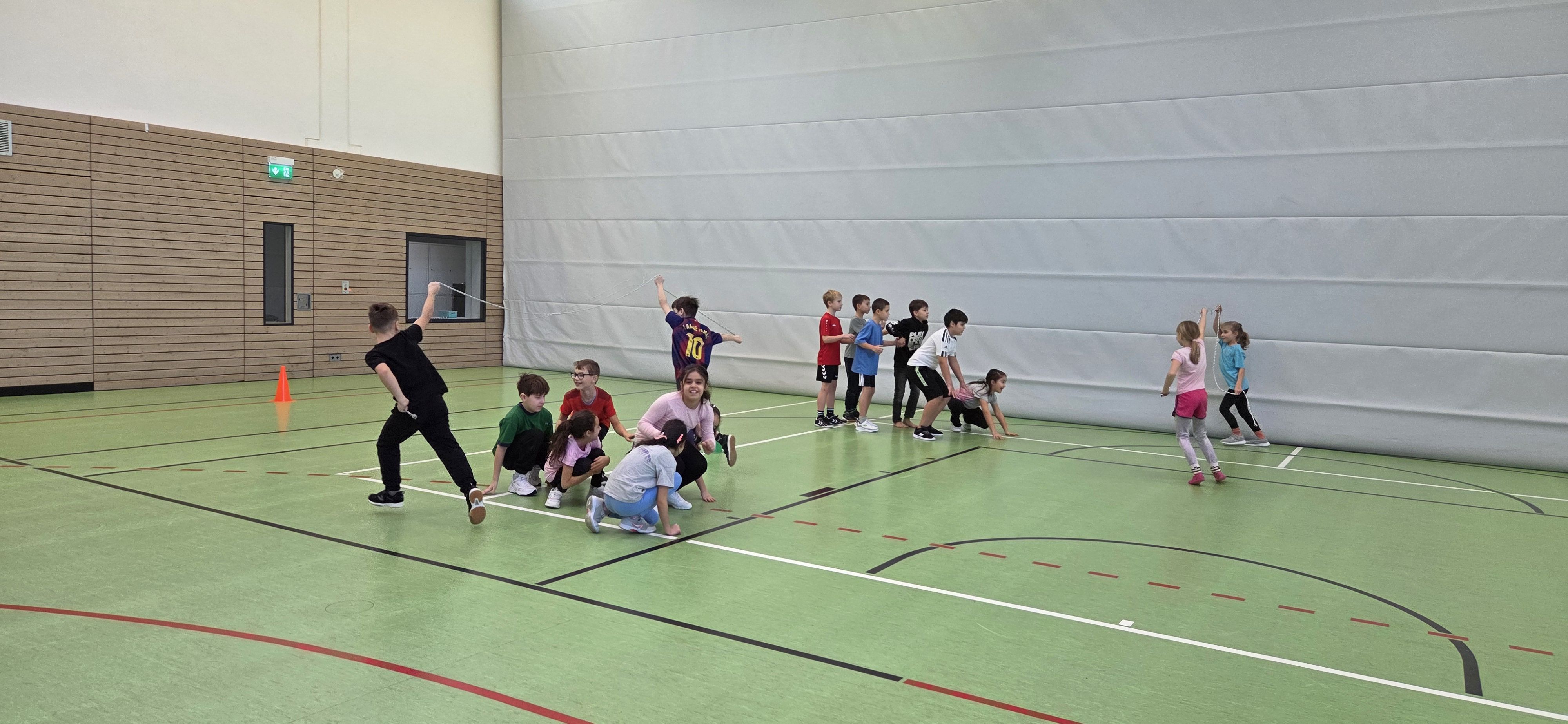 Anschließend übten wir verschiedene Paarsprünge. Besonders lustig waren der Schulter-an-Schulter-Sprung und der Nase-an-Nase-Sprung. Dabei mussten wir gut zusammenarbeiten und viel lachen. Danach durften wir durch ein langes Seil (Long Rope) rennen und springen – gar nicht so einfach, aber richtig cool!
