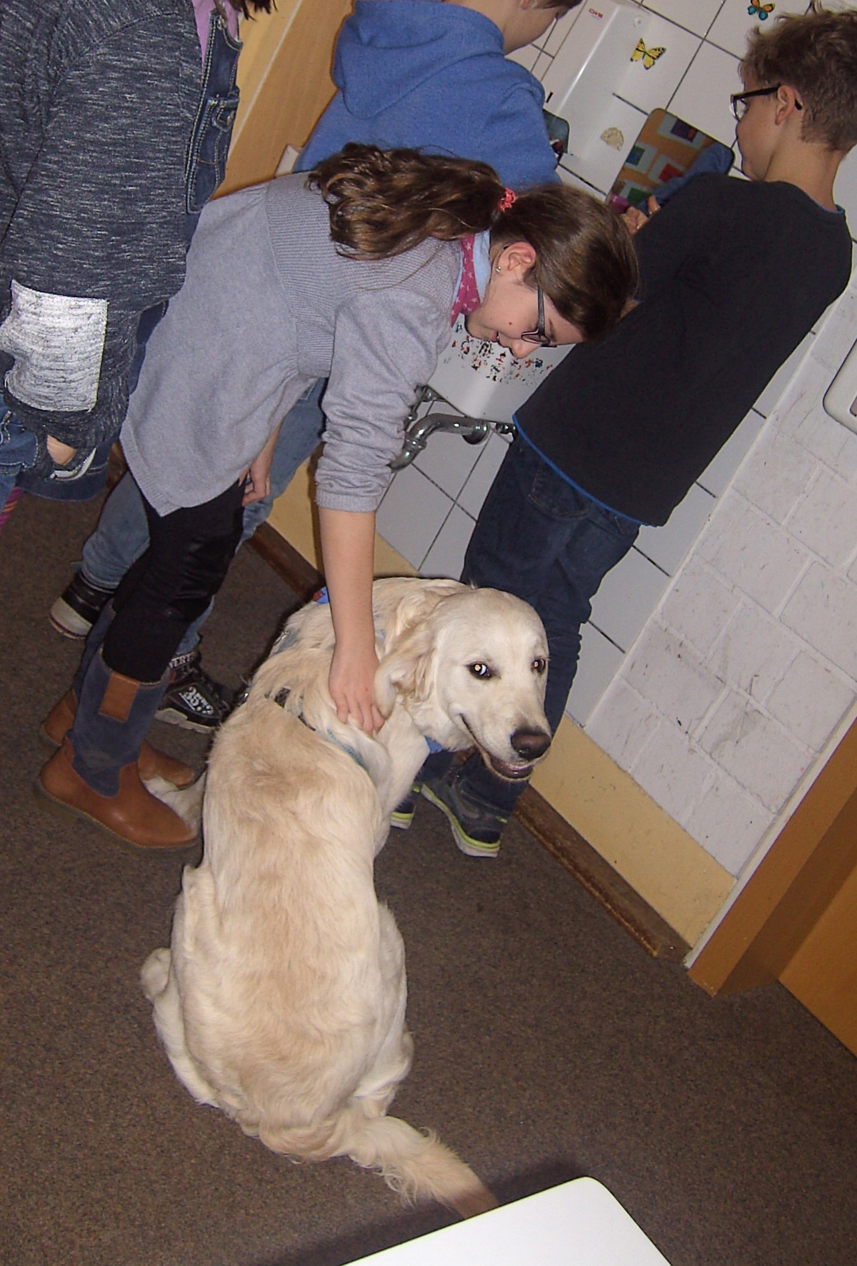 Heute durfte ich wieder mit zur Schule. Dort haben sich schon viele gefreut und mich begrüßt. Immer wieder wurde ich gestreichelt, das war schön. Ich kenne mich auch schon gut dort aus und weiß, wo es langgeht.