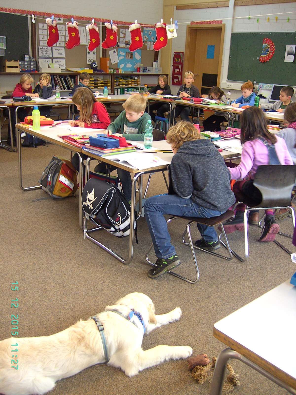 In der 4c wurde dann ein Lernwörtertest geschrieben. Da musste ich ganz still sein und warten. Das habe ich schon gut geschafft.