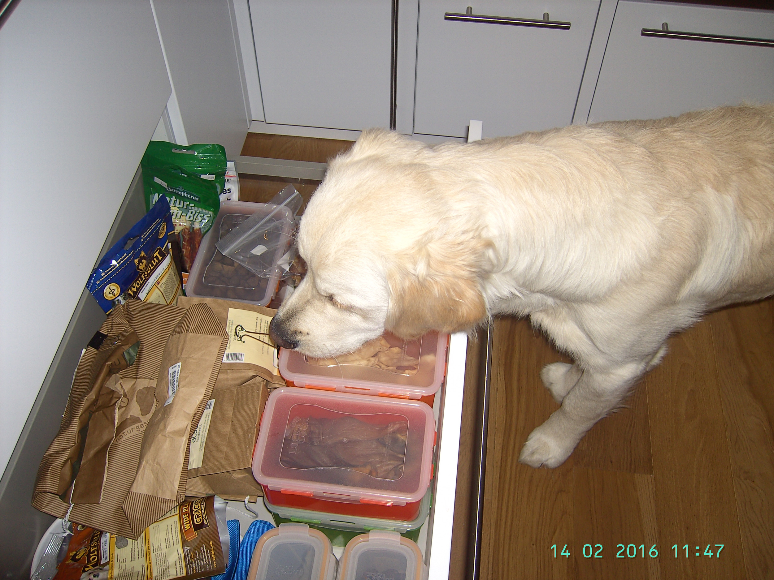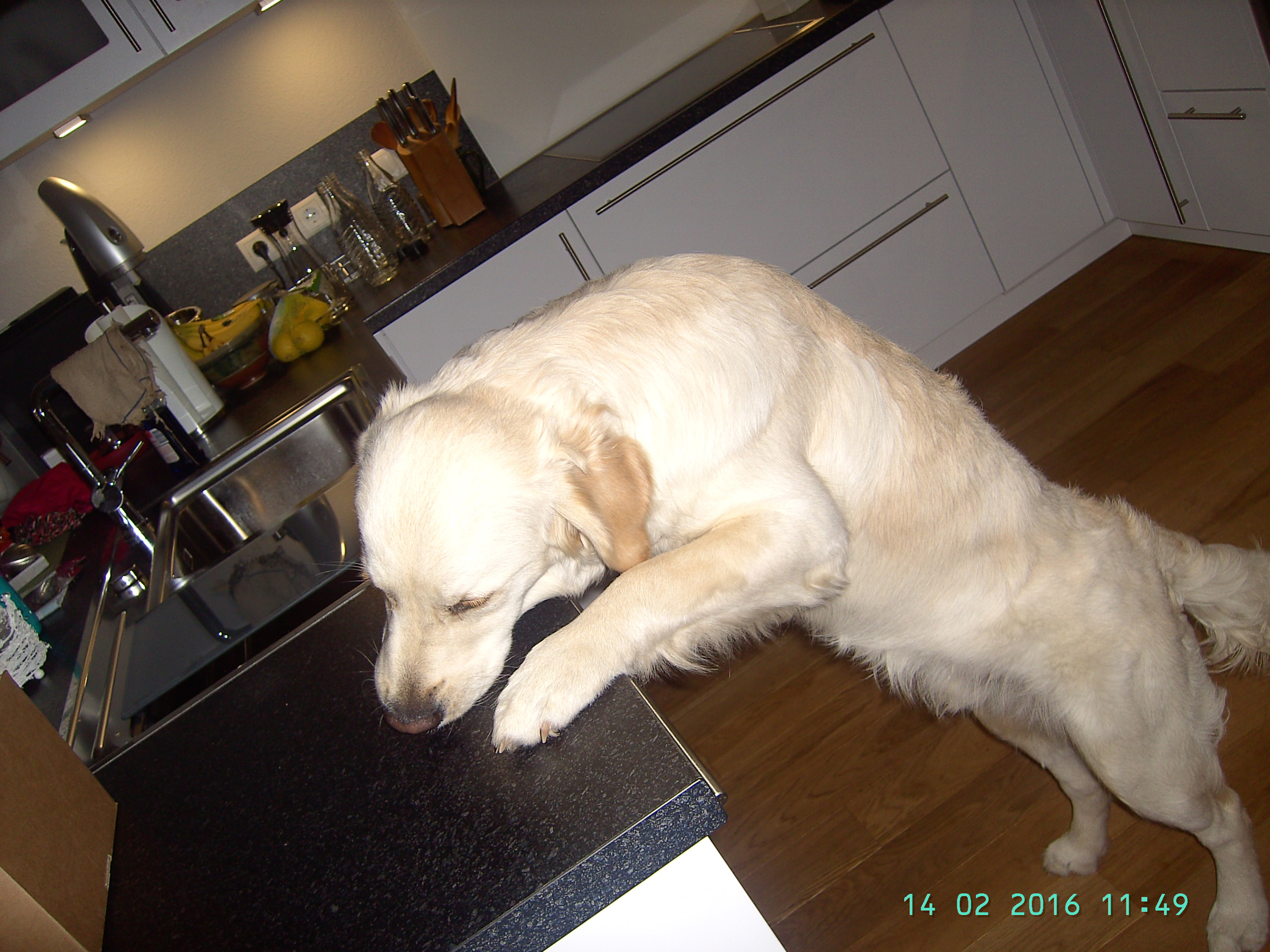 Ist aber noch alles da, was man so täglich verputzen kann. Vorsichtshalber habe ich auch auf der Arbeitsfläche geschaut, ob alles aufgeräumt und sauber ist. Das dürft ihr aber nicht verraten, denn ich darf eigentlich da gar nicht hoch und werde immer gleich wieder runtergeschickt, wenn man mich dabei erwischt. ;)