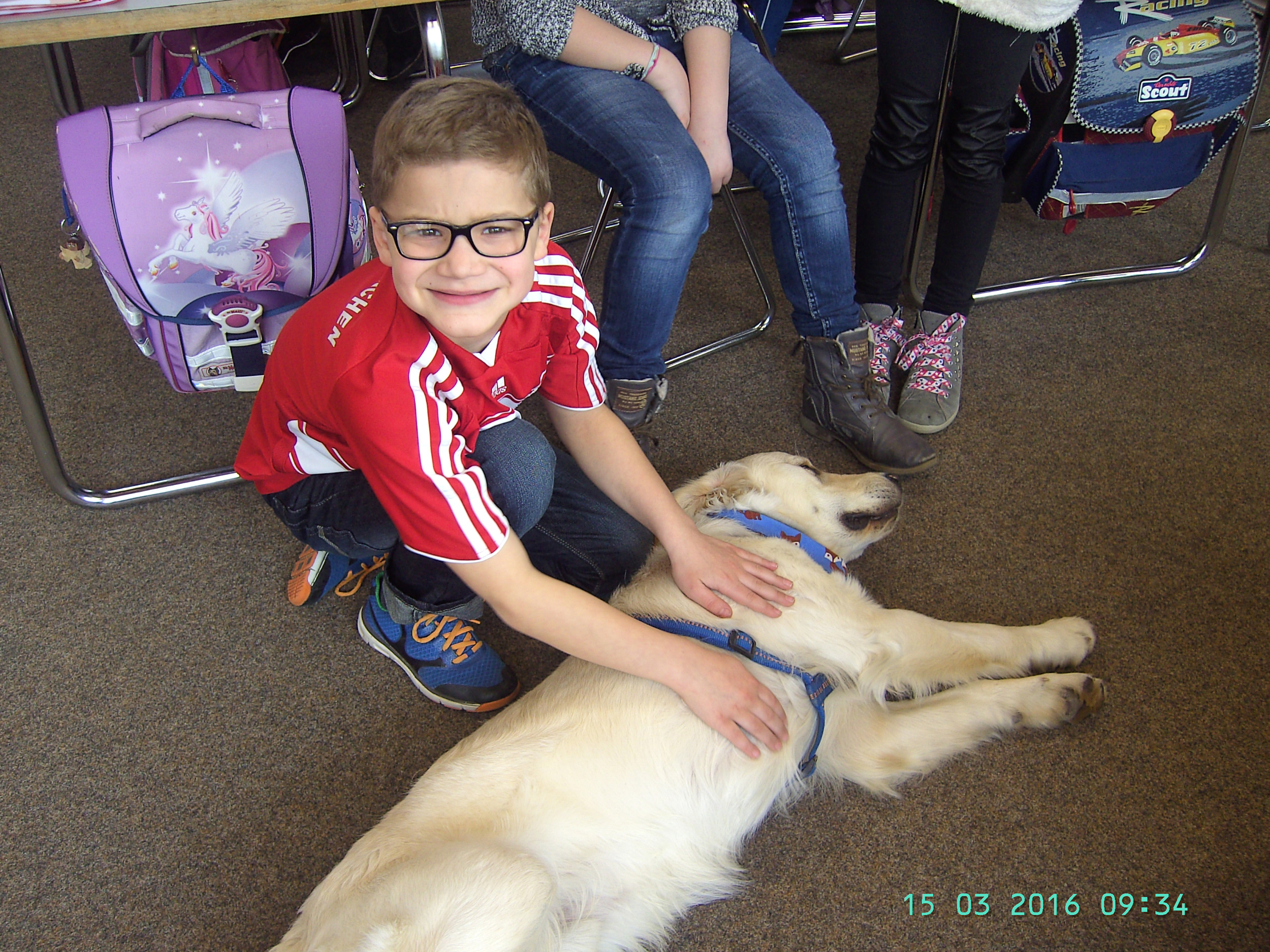 Natürlich bin ich dann erst einmal bei allen vorbeigelaufen und habe mich streicheln lassen. Danach hat Martha aus der 4c noch einmal erklärt, auf was die Kinder achten sollen, wenn sie mir im Schulhaus begegnen.