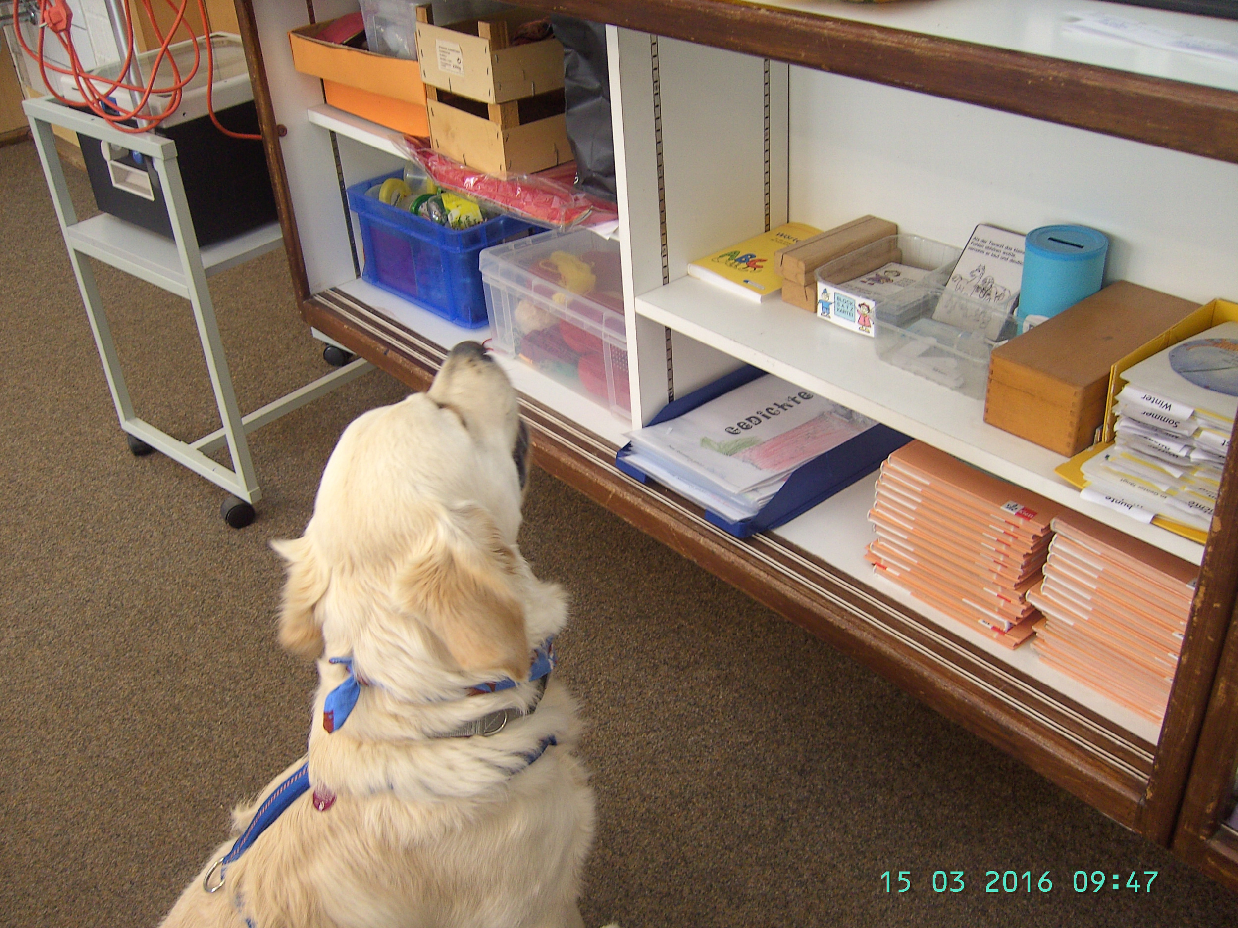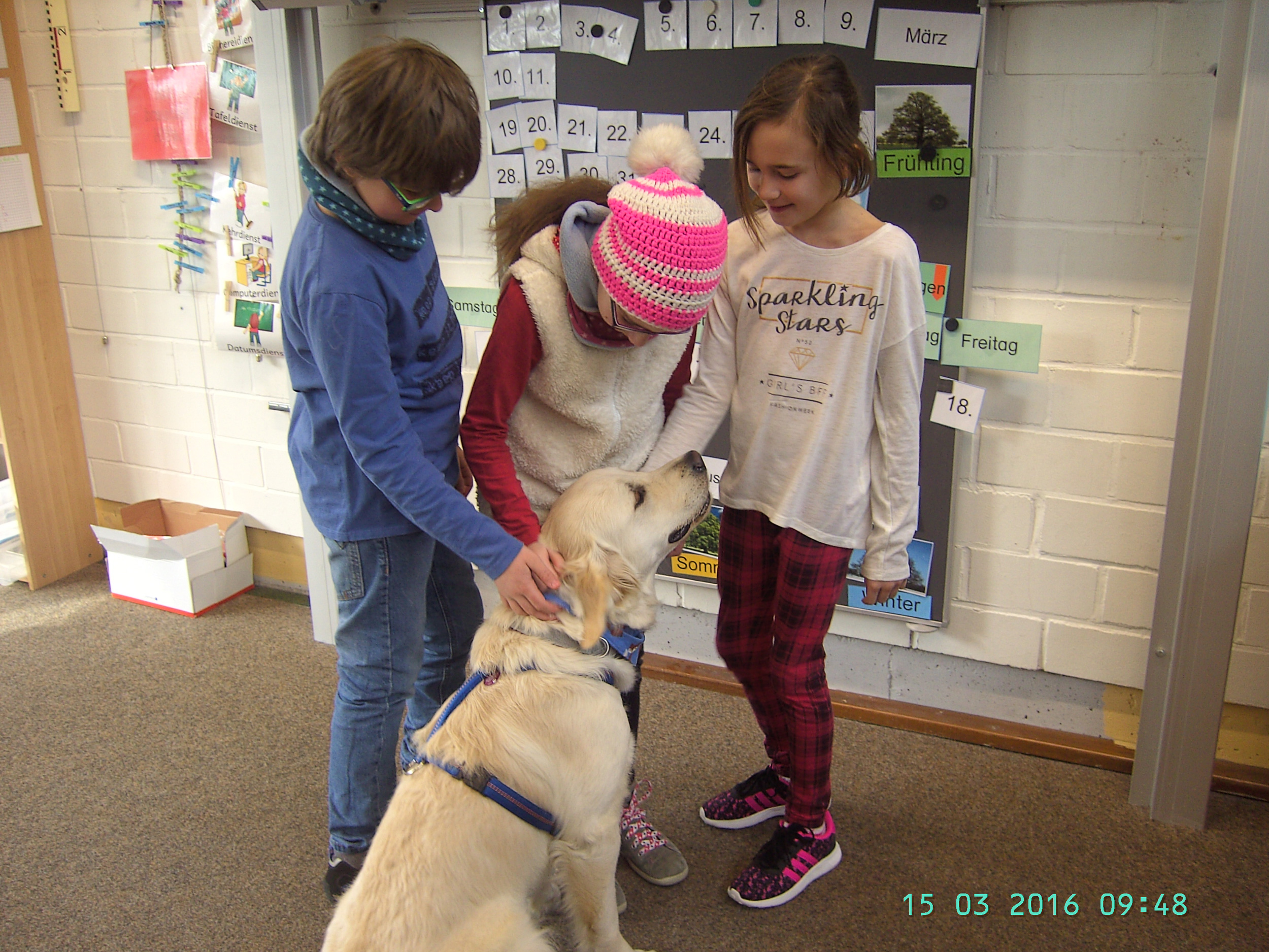 Dann gab es auch noch viele Fragen. So wurde ich nach meiner Lieblingsfarbe gefragt (blau) und nach meiner besten Freundin (Maggie). Am Ende haben wir noch ein lustiges Schnüffelspiel gemacht: Ich musste rausfinden, in welchen Händen meine Leckerlis liegen. Einige Kinder haben dann auch noch geschafft, dass ich mich auf ihr Kommando hingesetzt habe. Danach haben wir uns verabschiedet und ich bin wieder ins Klassenzimmer der 4c.