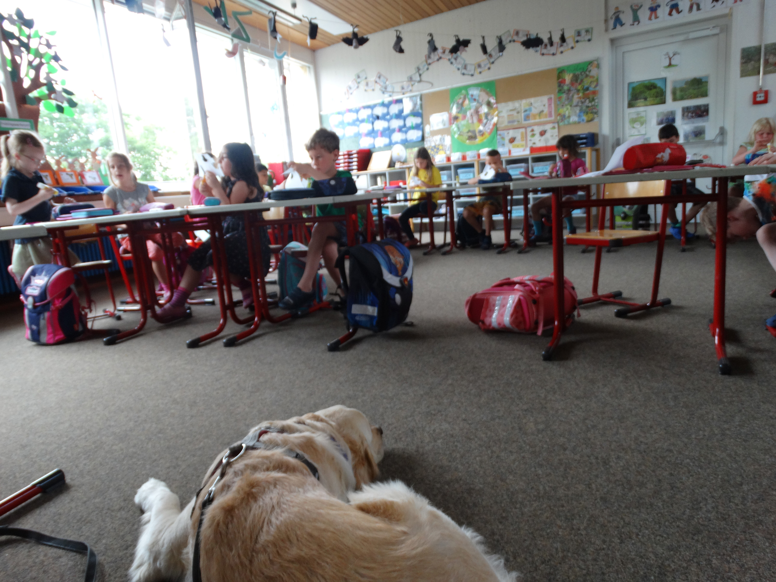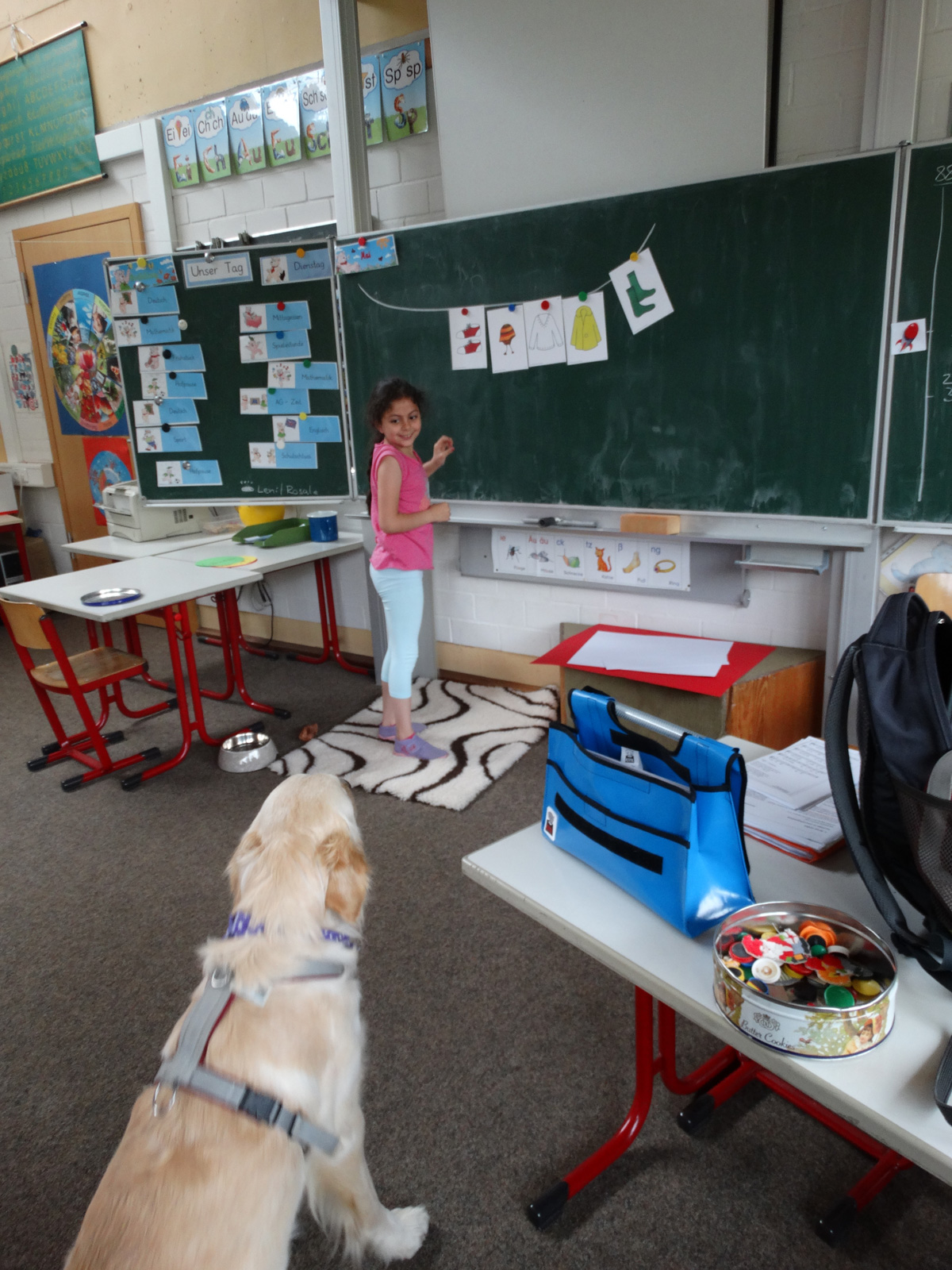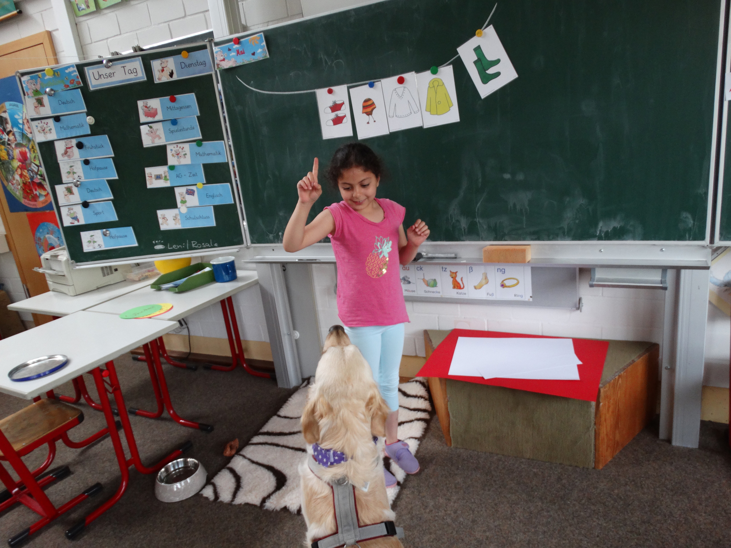 Die Kinder durften dann immer ein Bild aufhängen. Das habe ich genau geprüft. Im Anschluss durften sie sich überlegen, ob ich sitzen, die Pfote geben oder einschlagen sollte. Die Kommandos haben sie schon gut und genau ausgeführt. Wie immer gab es danach für mich eine Belohnung.