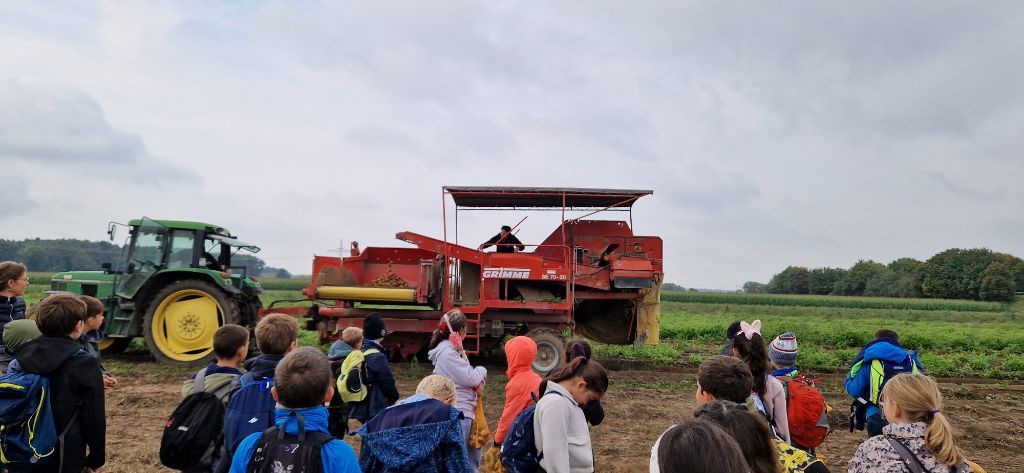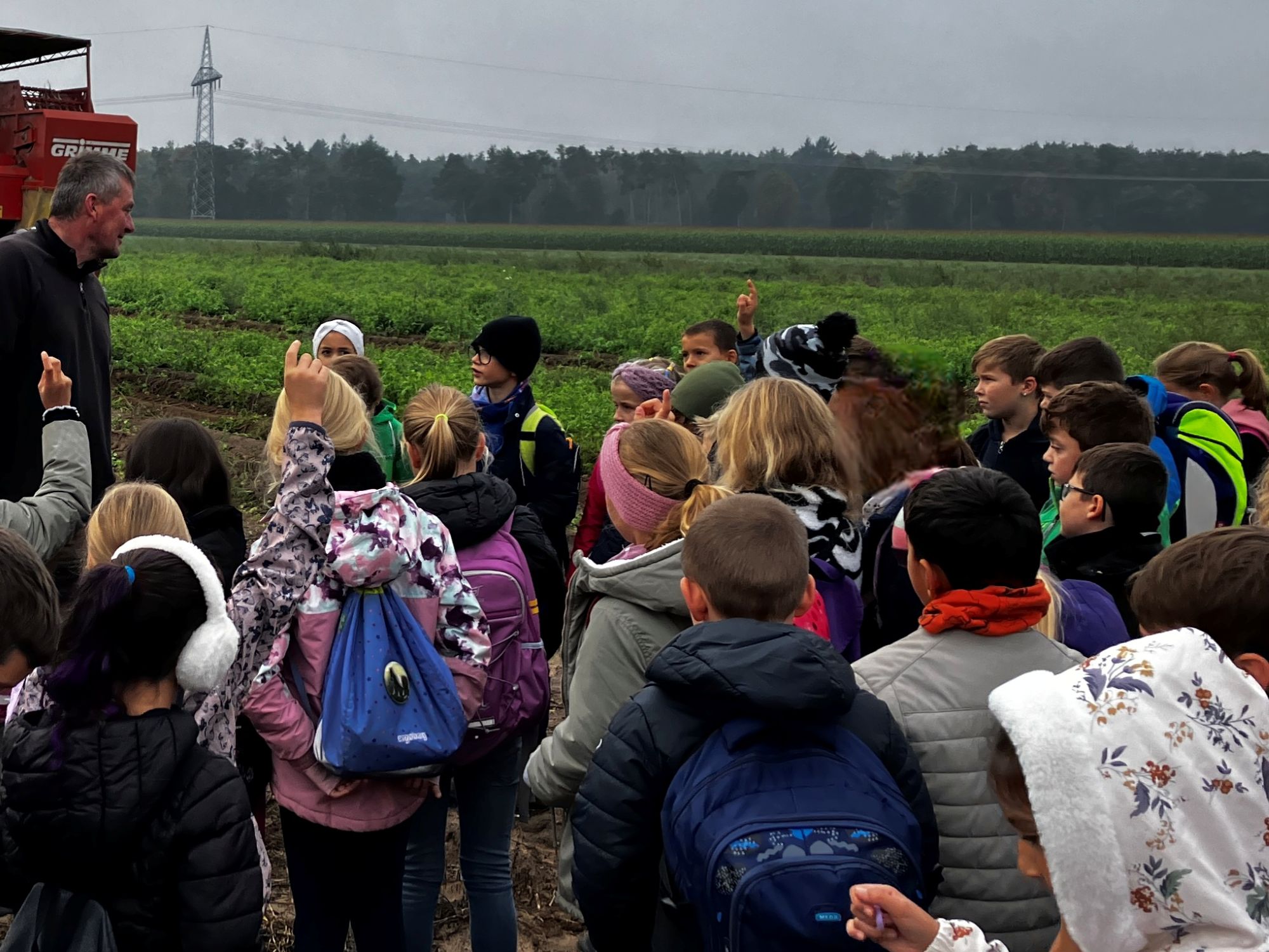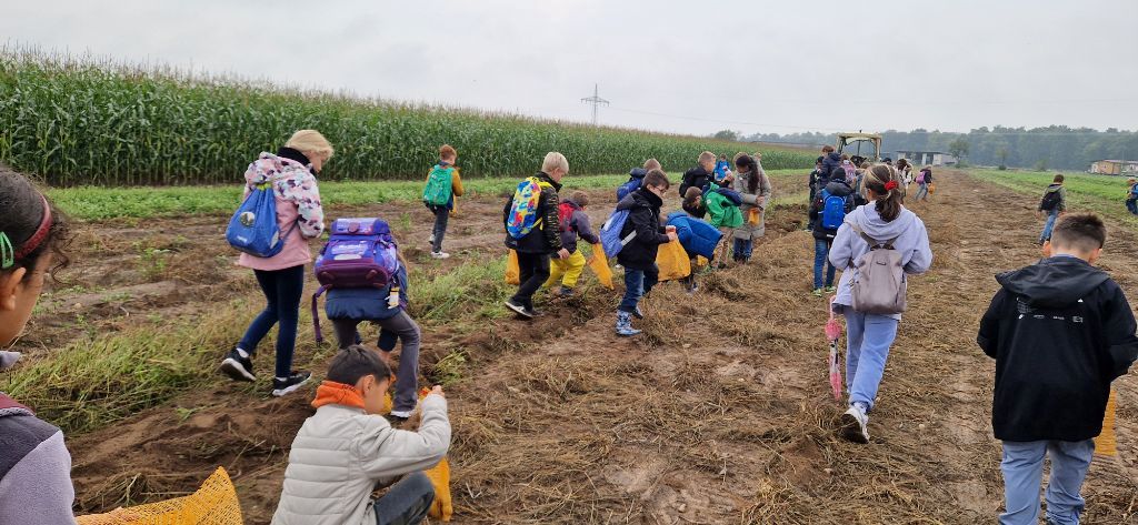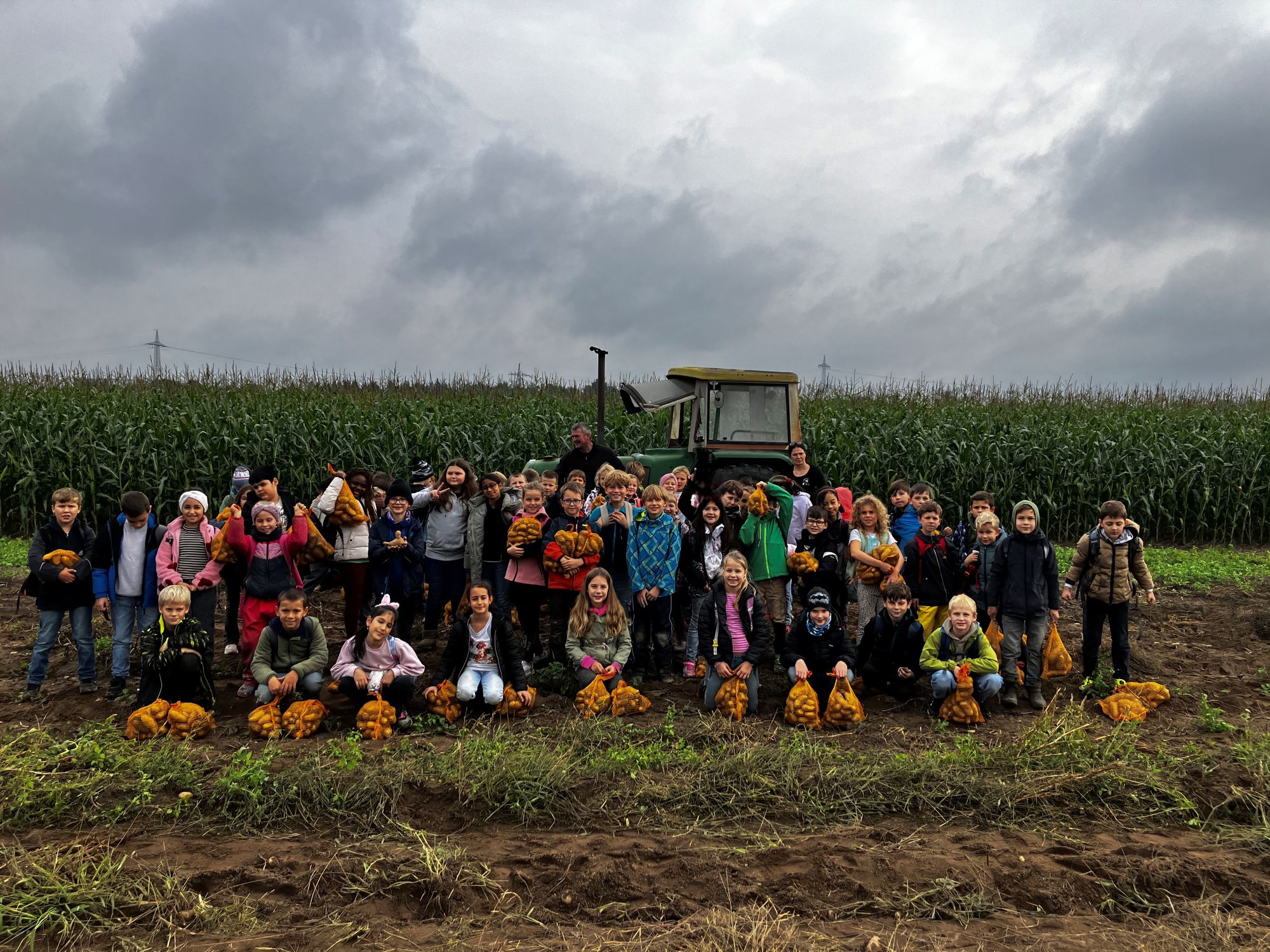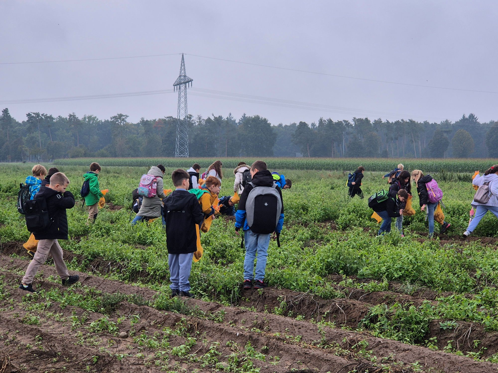 Am Dienstag, 30.09.2025, machten sich die dritten Klassen der Adolf-Kußmaul-Schule auf den Weg zum Kartoffelacker der Familie Maag. Nach einem kurzen Fußmarsch wurden wir bereits herzlich von Frau und Herrn Maag empfangen.