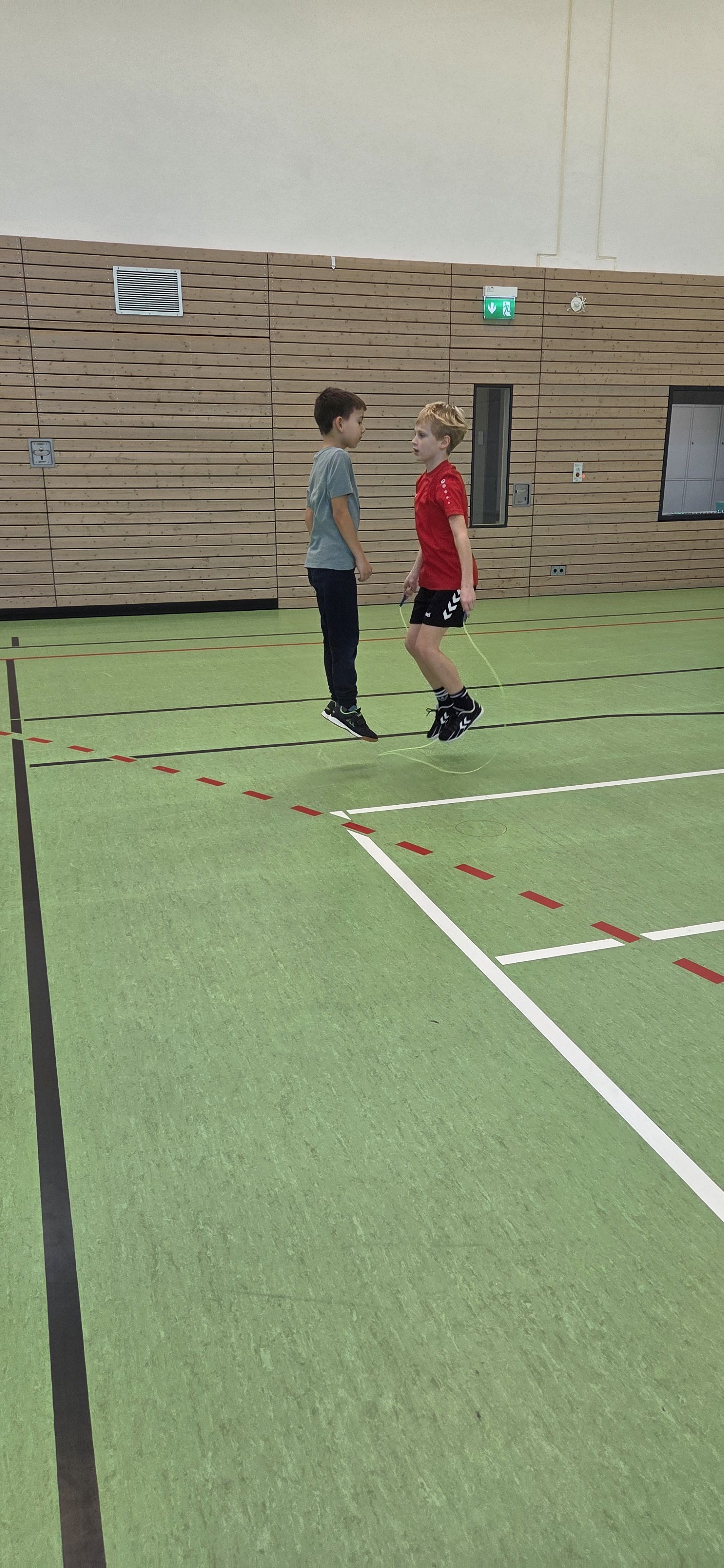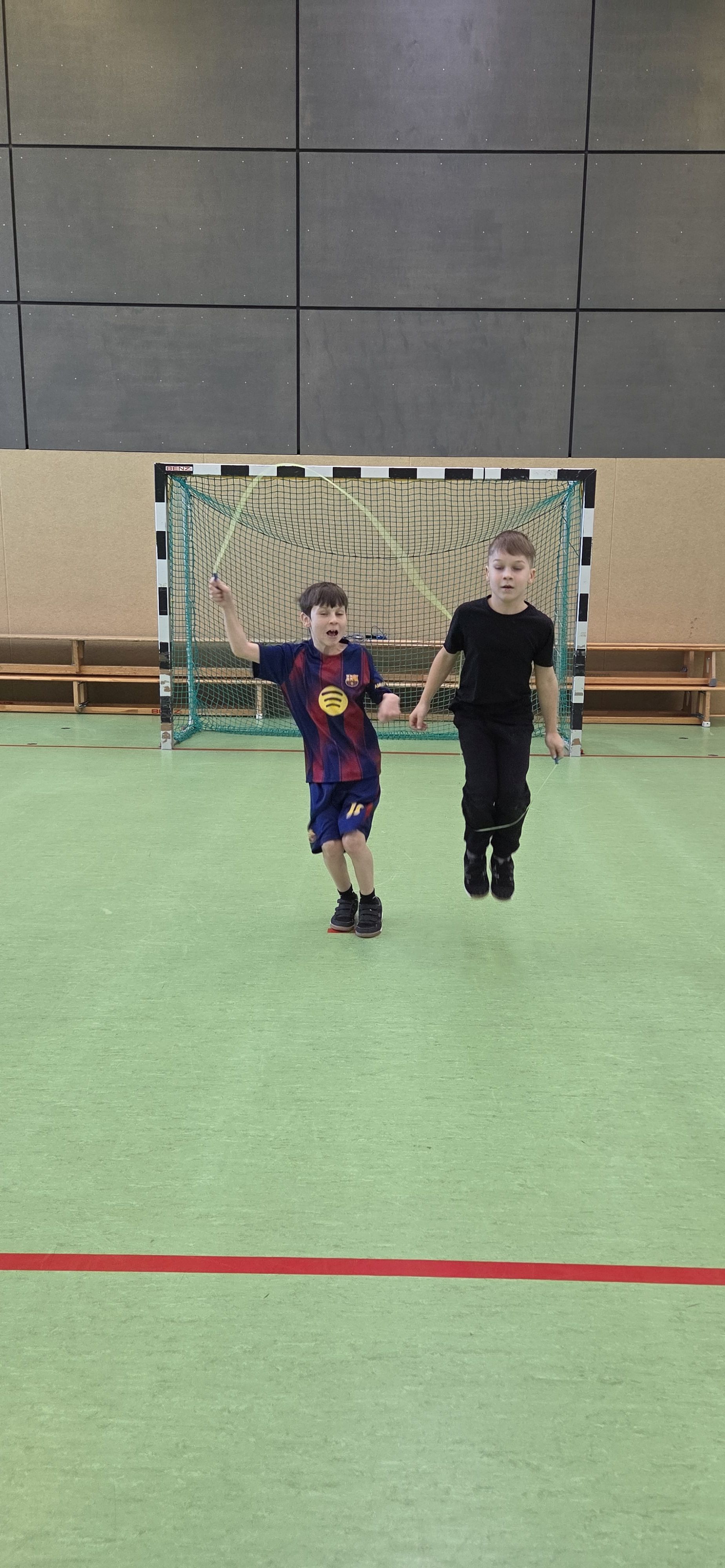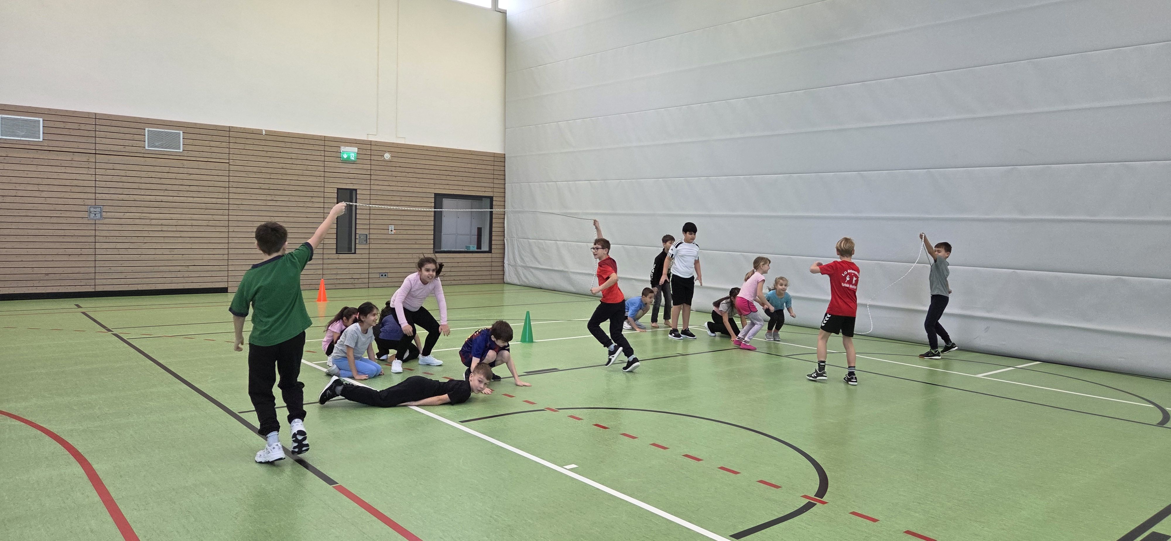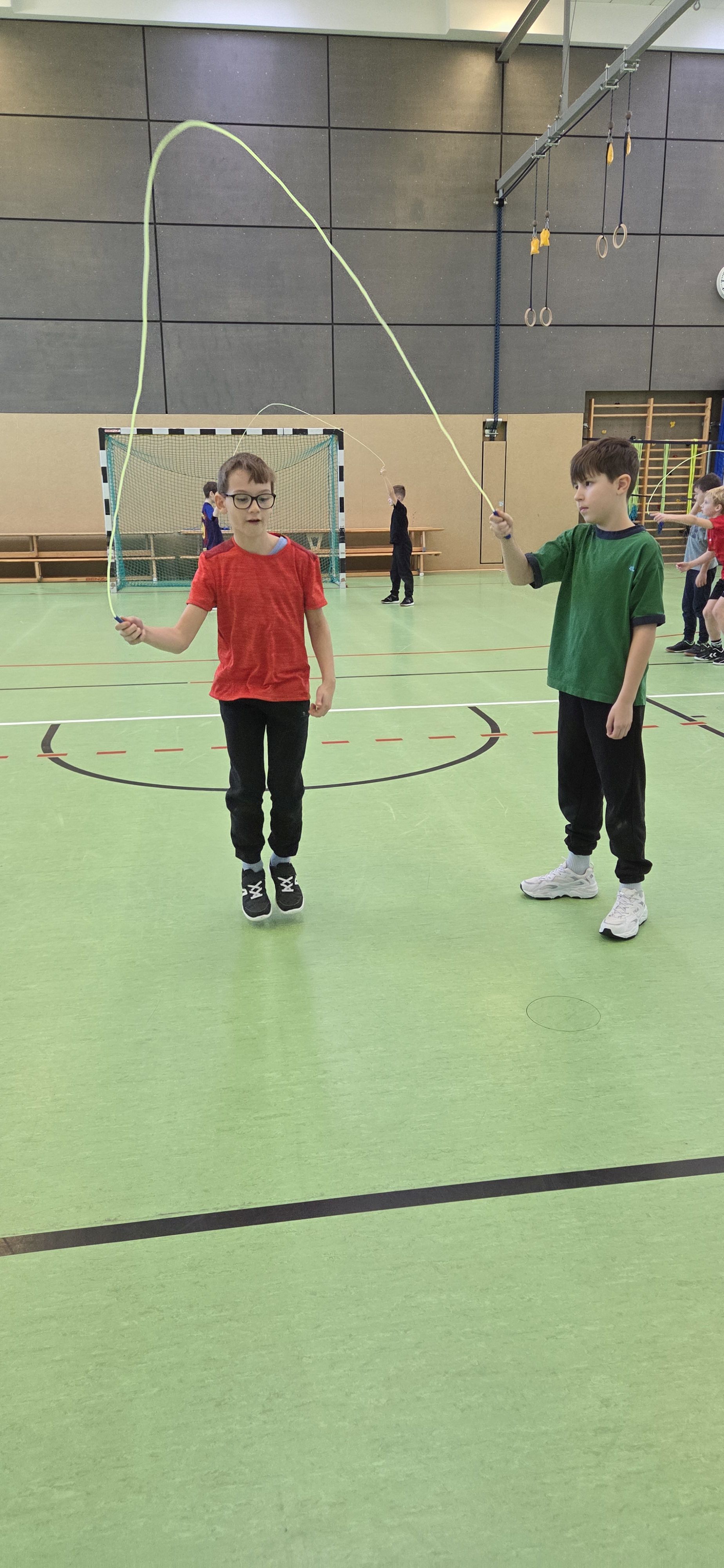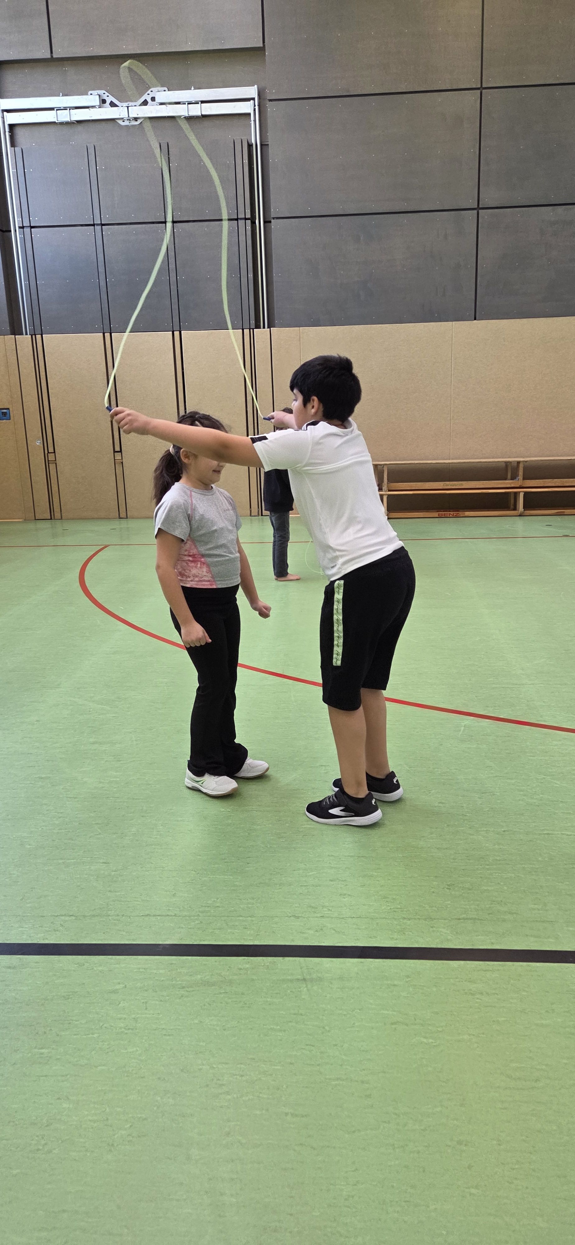 Anschließend übten wir verschiedene Paarsprünge. Besonders lustig waren der Schulter-an-Schulter-Sprung und der Nase-an-Nase-Sprung. Dabei mussten wir gut zusammenarbeiten und viel lachen. Danach durften wir durch ein langes Seil (Long Rope) rennen und springen – gar nicht so einfach, aber richtig cool!
