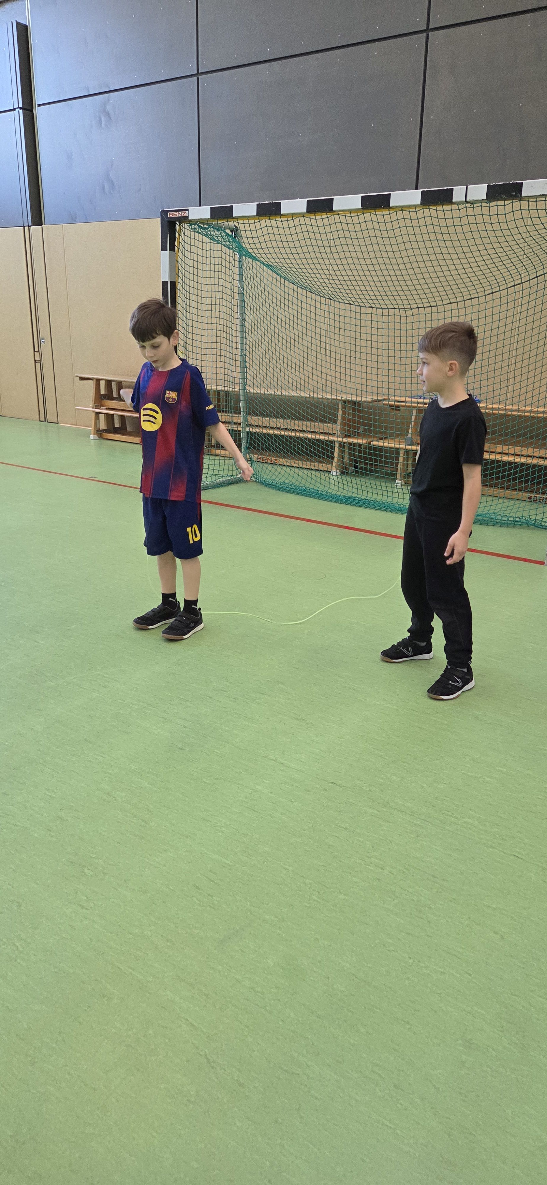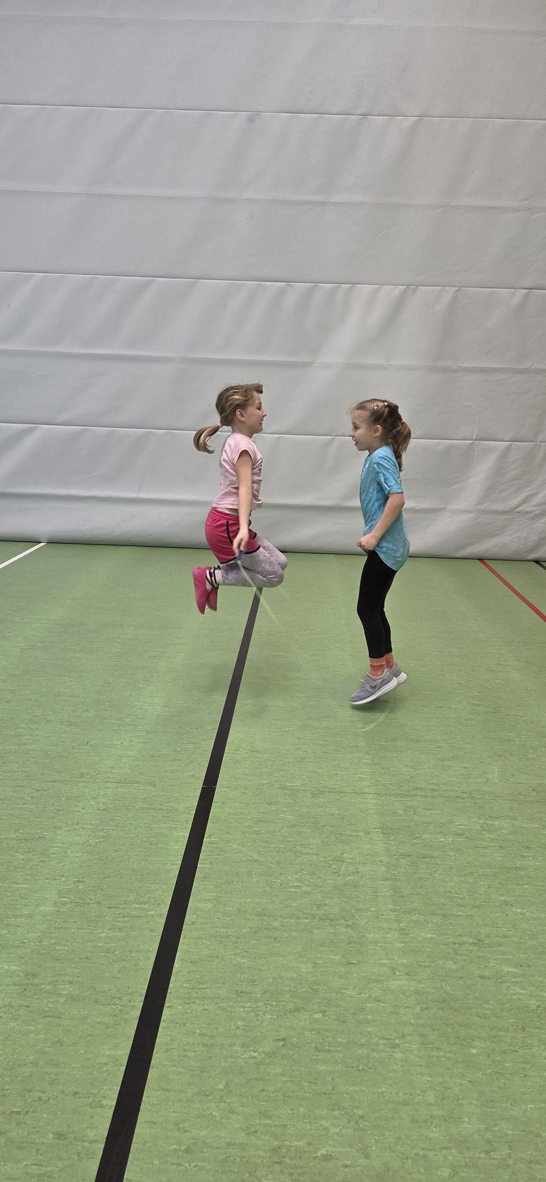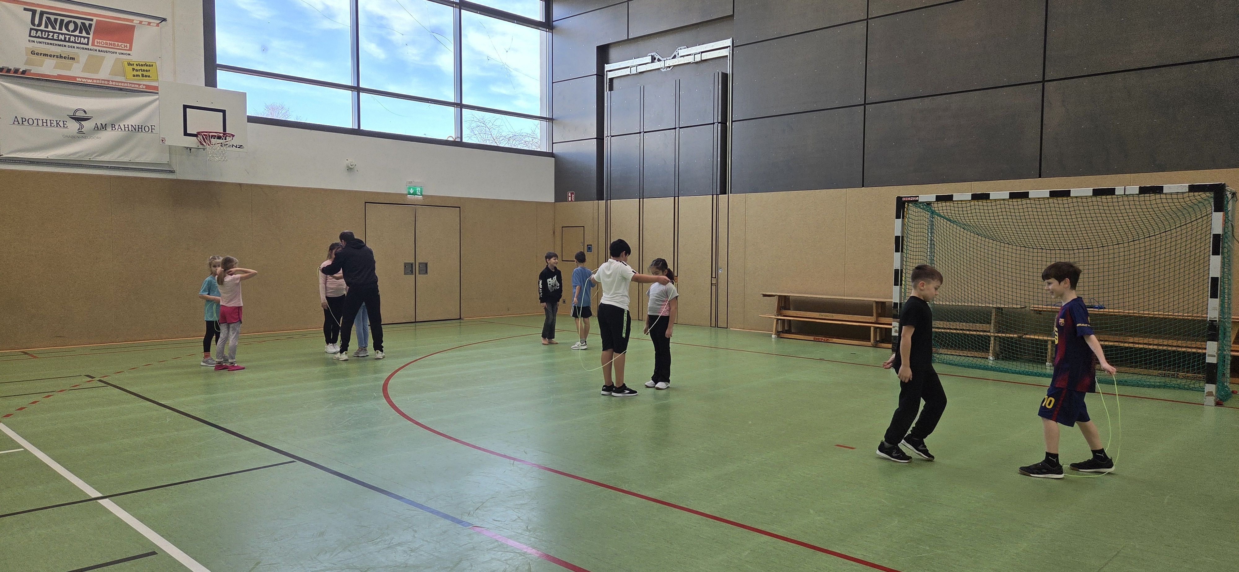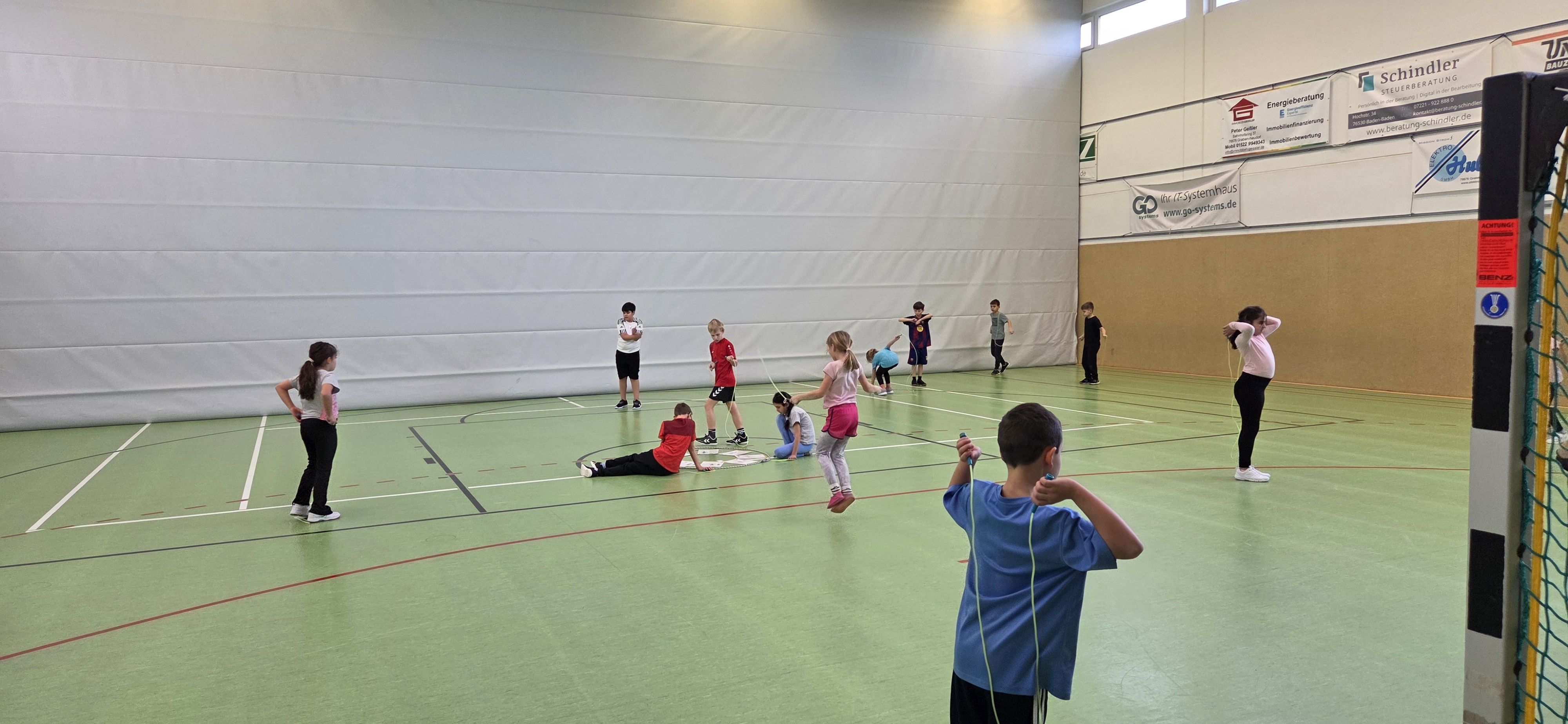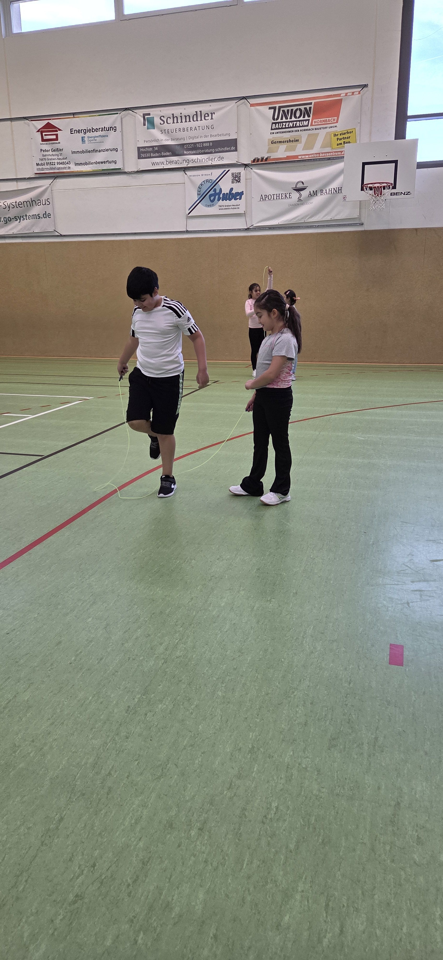Anschließend übten wir verschiedene Paarsprünge. Besonders lustig waren der Schulter-an-Schulter-Sprung und der Nase-an-Nase-Sprung. Dabei mussten wir gut zusammenarbeiten und viel lachen. Danach durften wir durch ein langes Seil (Long Rope) rennen und springen – gar nicht so einfach, aber richtig cool!